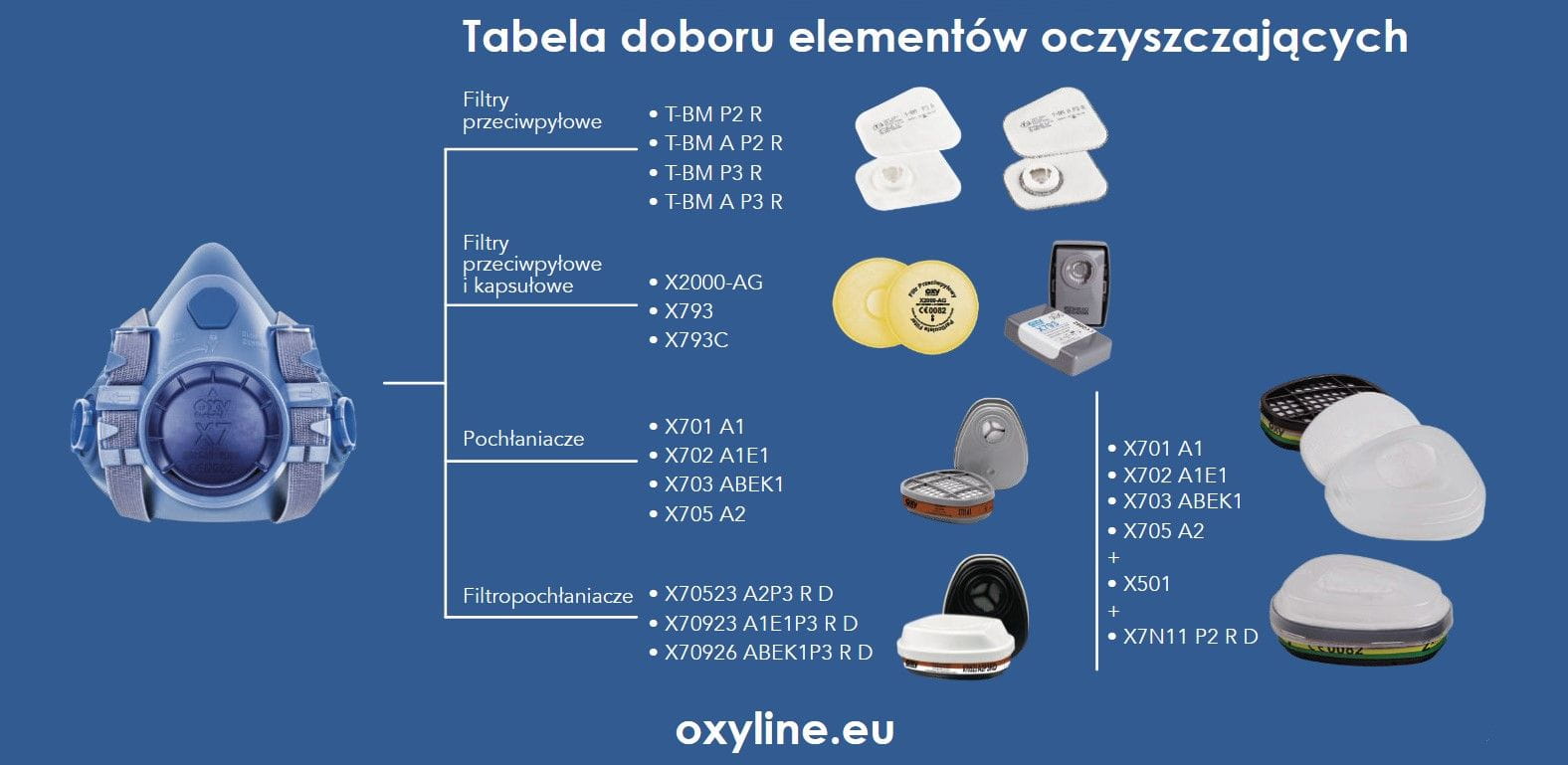 Półmaska X7 może być używana z filtrami T-BM P2 R, T-BM A P2 R, T-BM P3 R, T-BM A P3 R, X2000-AG P3 R, filtrami kapsułkowymi X793 P3 R, X793C AP3 R, pochłaniaczami X701 A1, X702 A1E1, X703 ABEK1 i filtropochłaniaczami X70523 A2P3 R D, X70923 A1E1 P3 R D, X70926 ABEK1 P3 R D