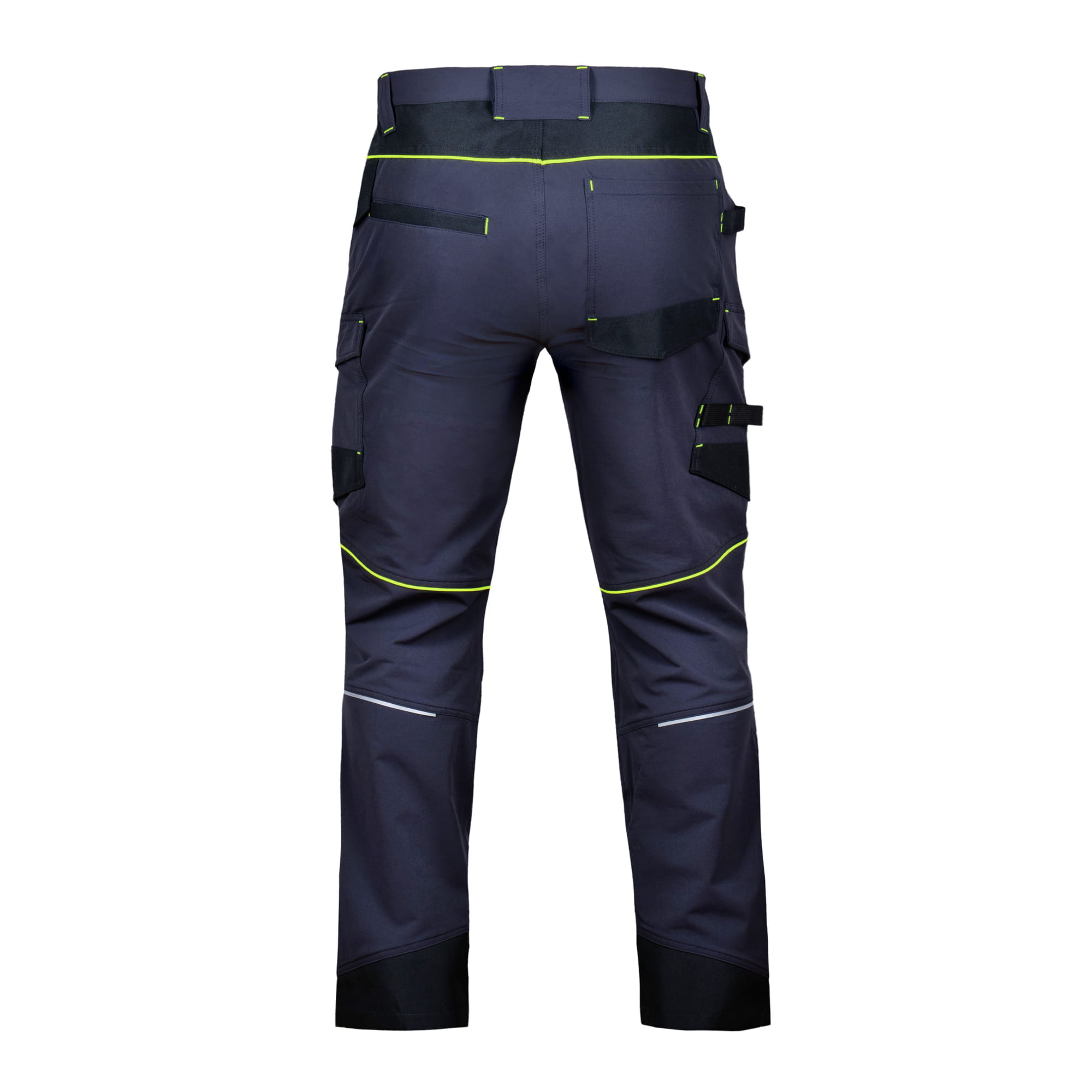 Spodnie TECHTREK firmy Procera wykonane zostały z elastycznej tkaniny w kolorze granatowym z czarnymi wzmocnieniami z tkaniny Oxford oraz neonowo zielonymi lamówkami.