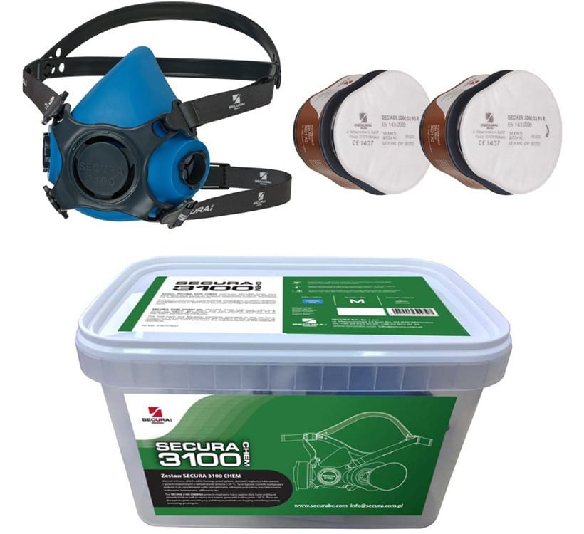 - zestaw SECURA 3100 CHEM składa się z dwufiltrowej półmaski SECURA 3100, dwóch pochłaniaczy 3031 A2 oraz dwóch filtrów SECAIR 3000.03 P3 R,